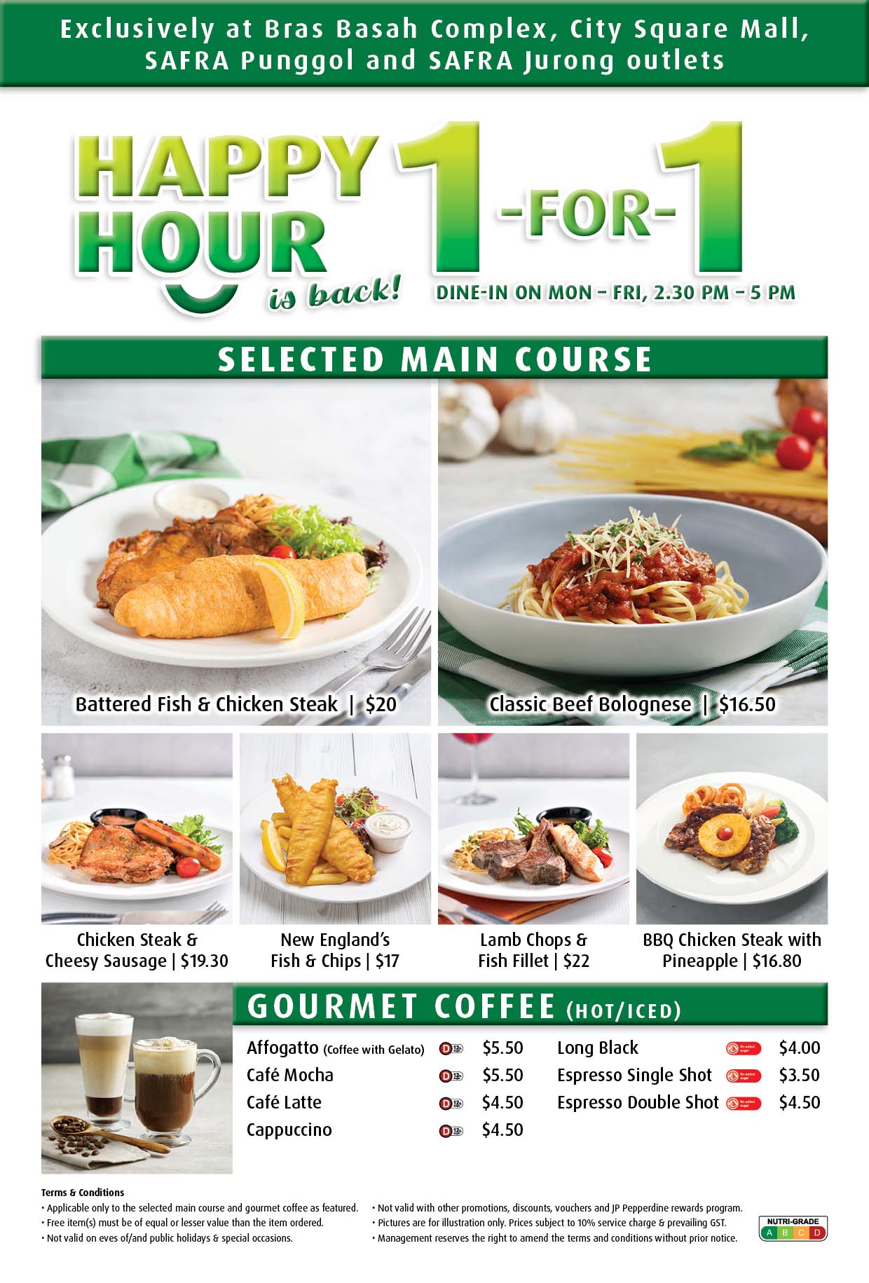 Mon to Fri, 2.30 pm to 5 pm at selected outlets